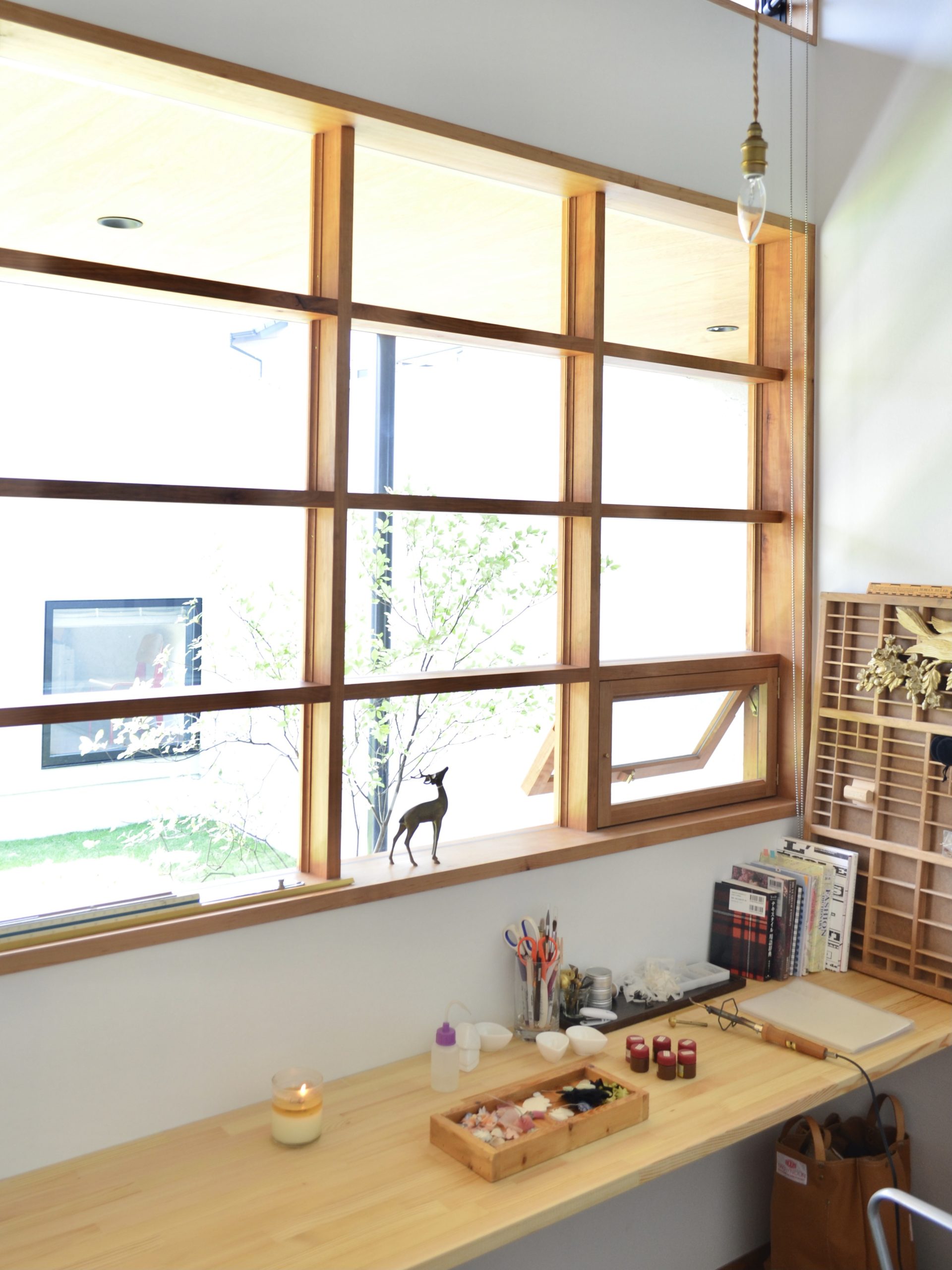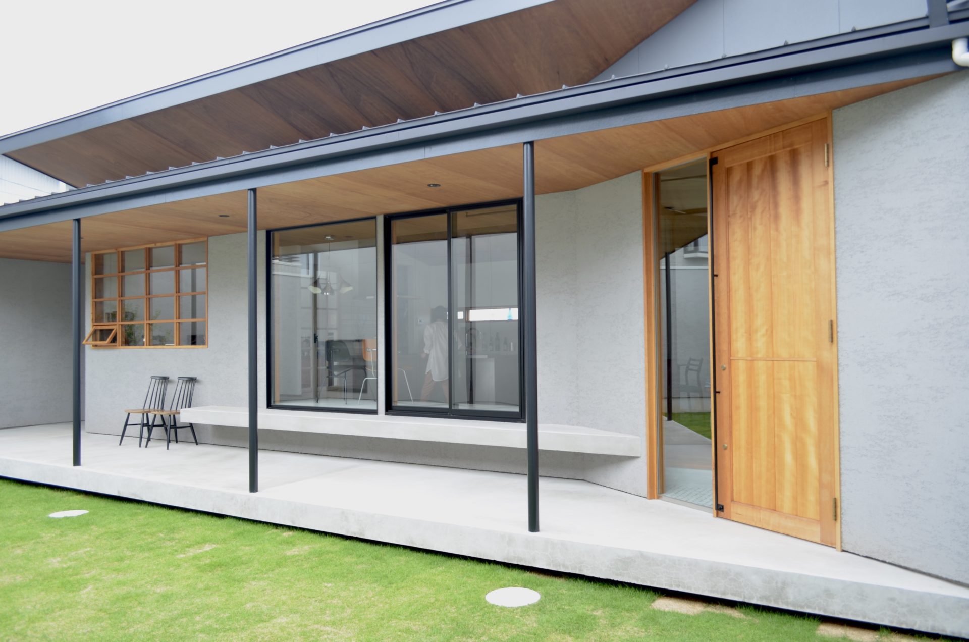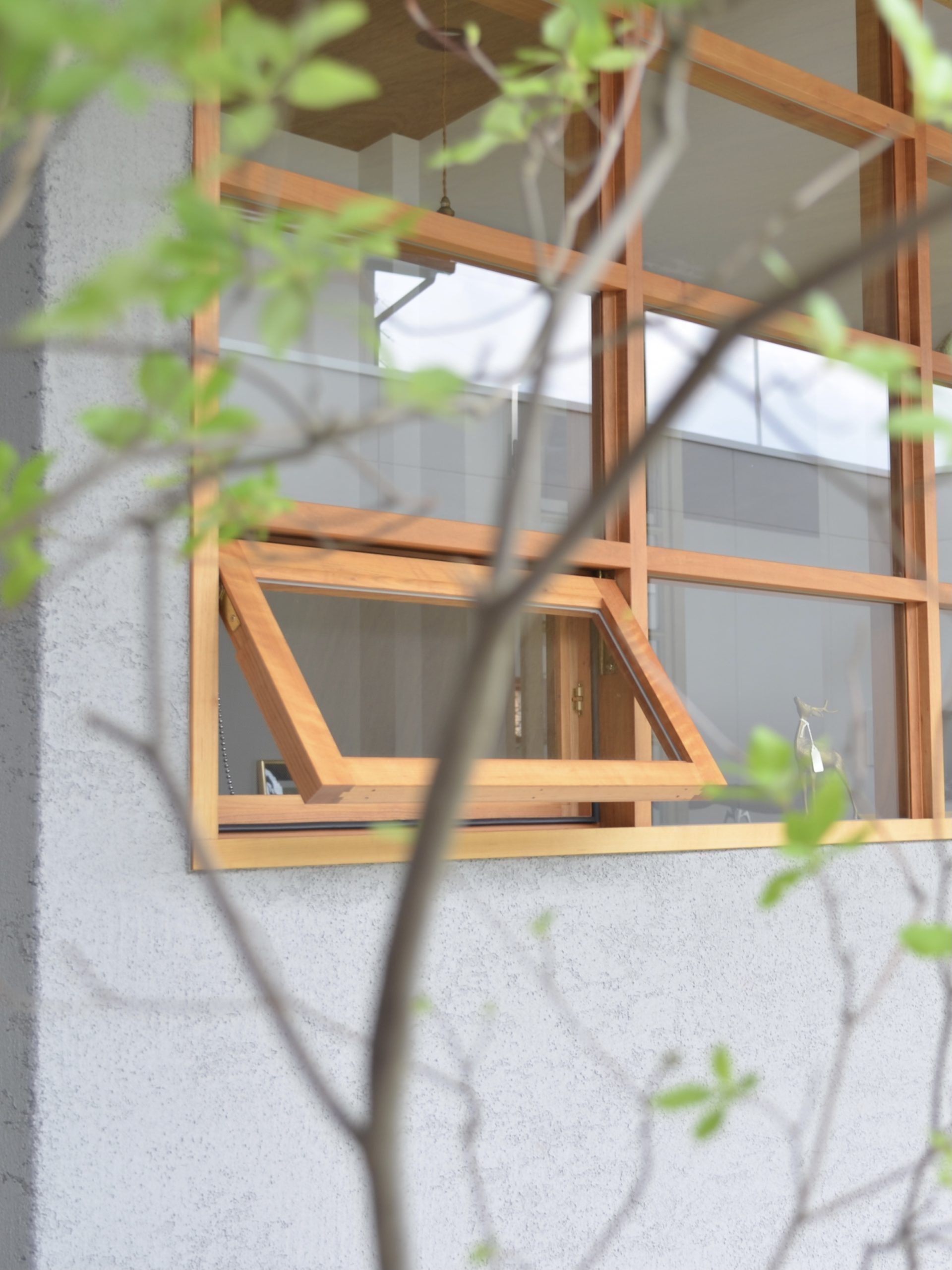 玄関までのアプローチに設置された木製格子窓、玄関扉、室内扉を制作させていただきました。